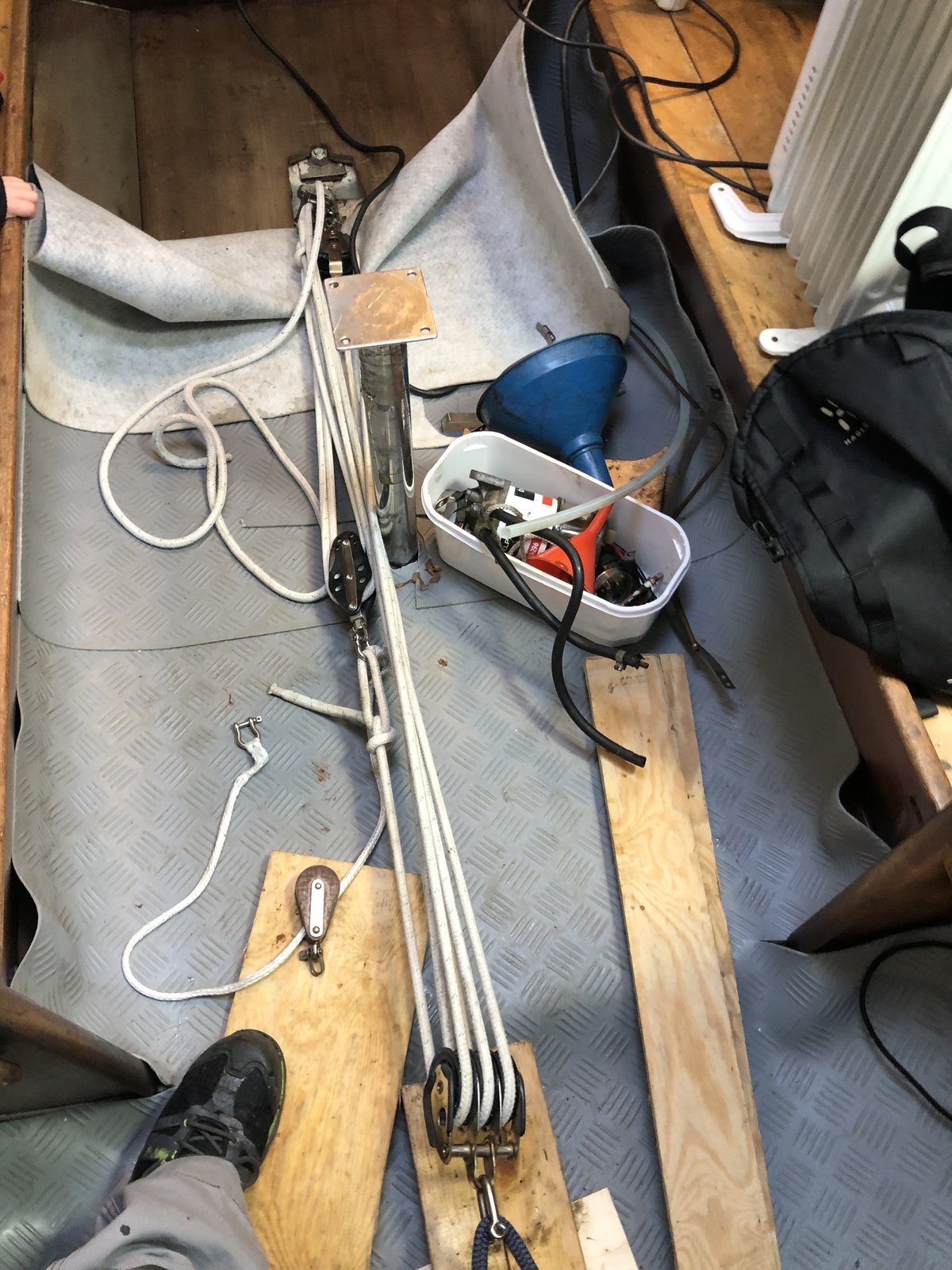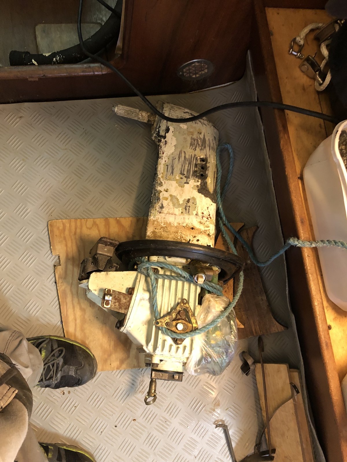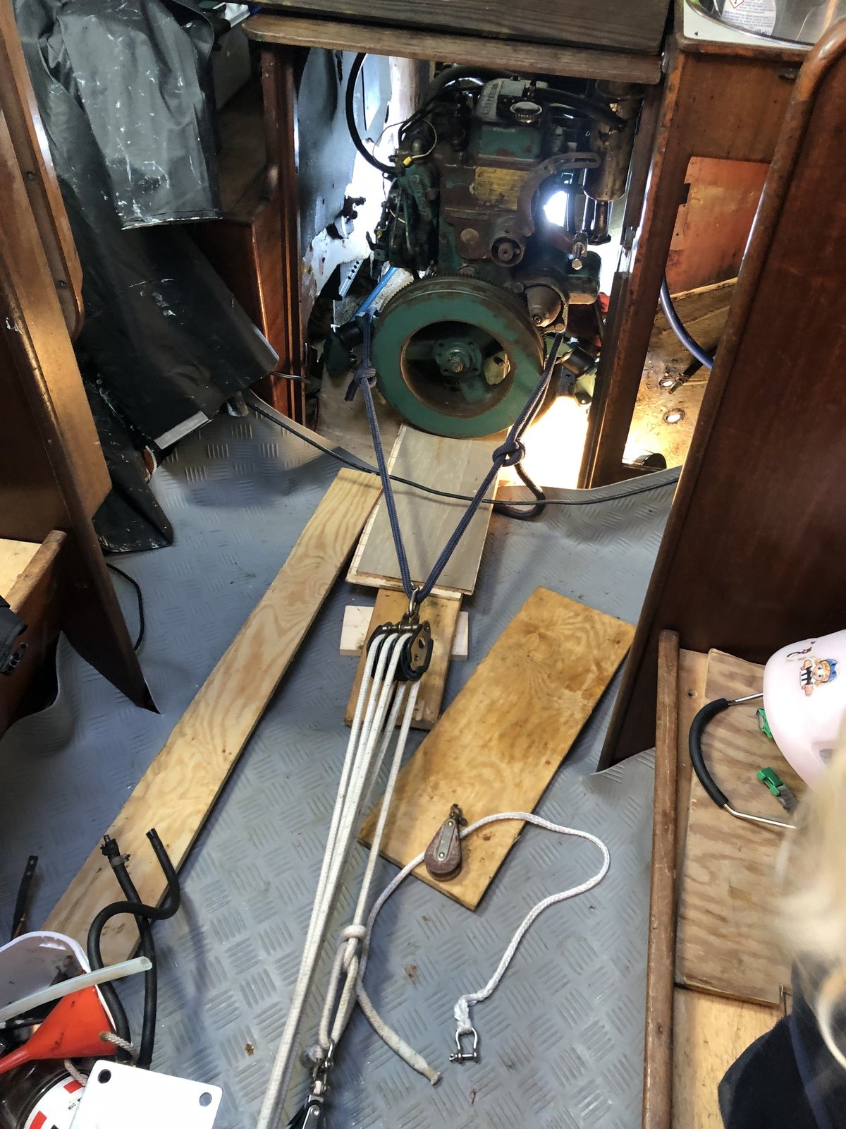 Jag kopplade ett spel i mastfoten och fäste sedan det i en hanfot genom svänghjulet. 5-skuren talja vilken togs hem på med en 4-skuren dito. När jag tog hem hände ingenting. Så jag lämnade hela rasket i spänn och krälade in genom bänkkistan och ruskade om med kofoten igen. Plopp! Så hoppade motorn fram och av axeln. Sedan var det bara att dra fram den på skivan jag hade lagt under.