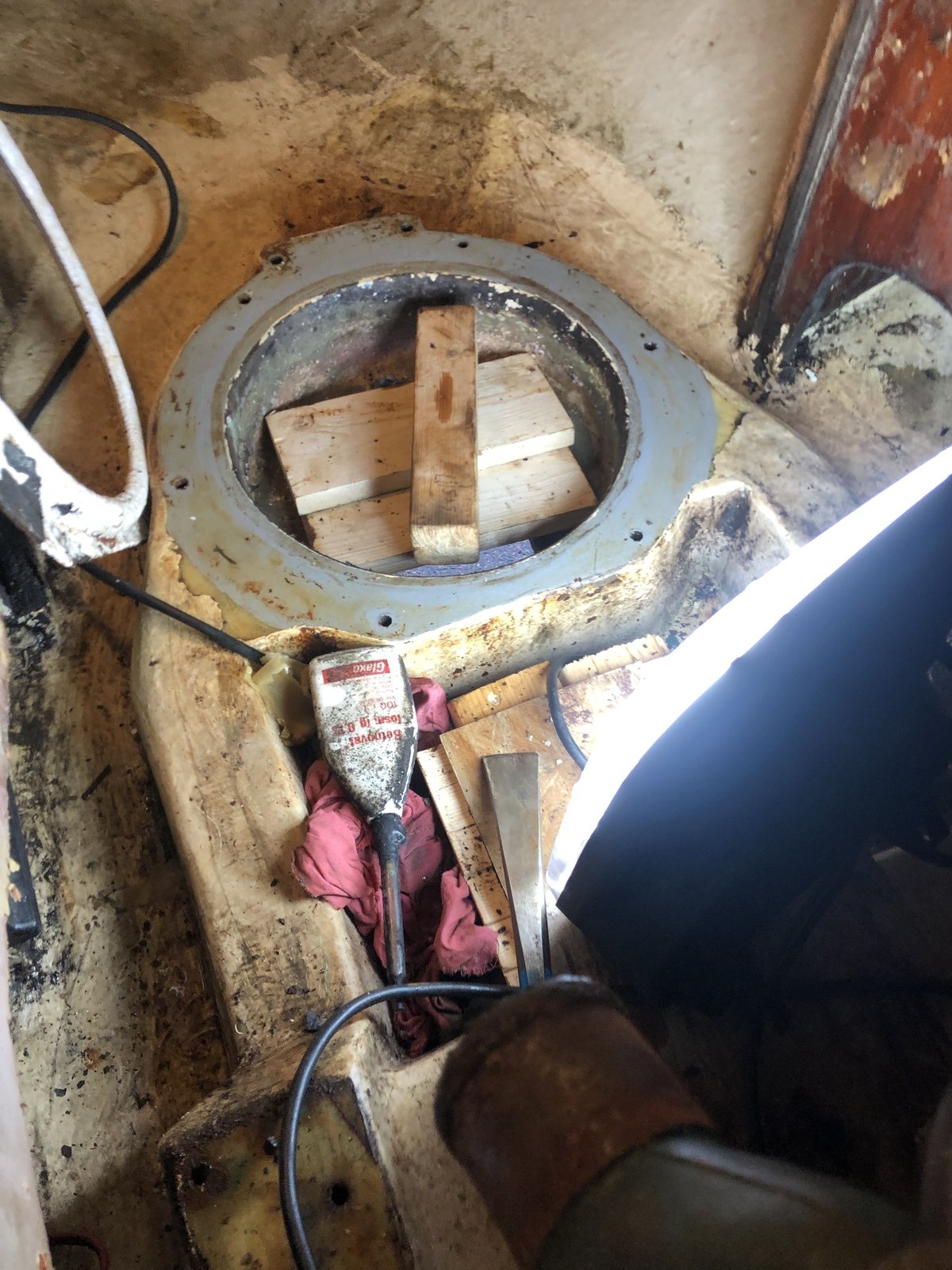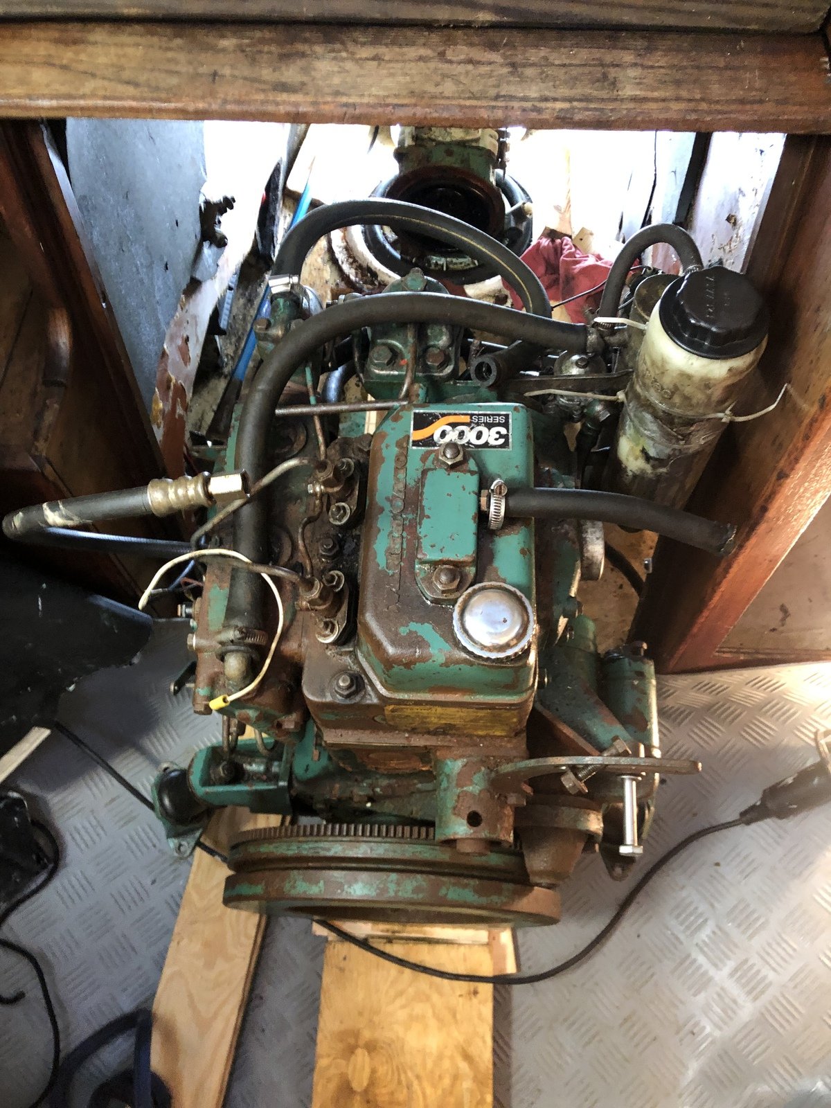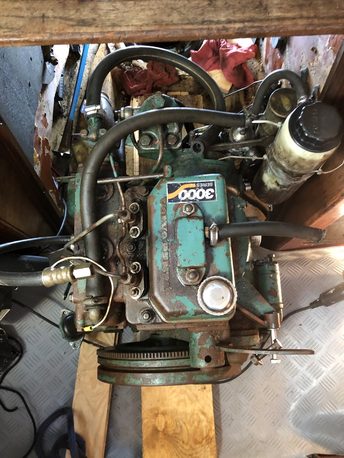 Jag kopplade ett spel i mastfoten och fäste sedan det i en hanfot genom svänghjulet. 5-skuren talja vilken togs hem på med en 4-skuren dito. När jag tog hem hände ingenting. Så jag lämnade hela rasket i spänn och krälade in genom bänkkistan och ruskade om med kofoten igen. Plopp! Så hoppade motorn fram och av axeln. Sedan var det bara att dra fram den på skivan jag hade lagt under.