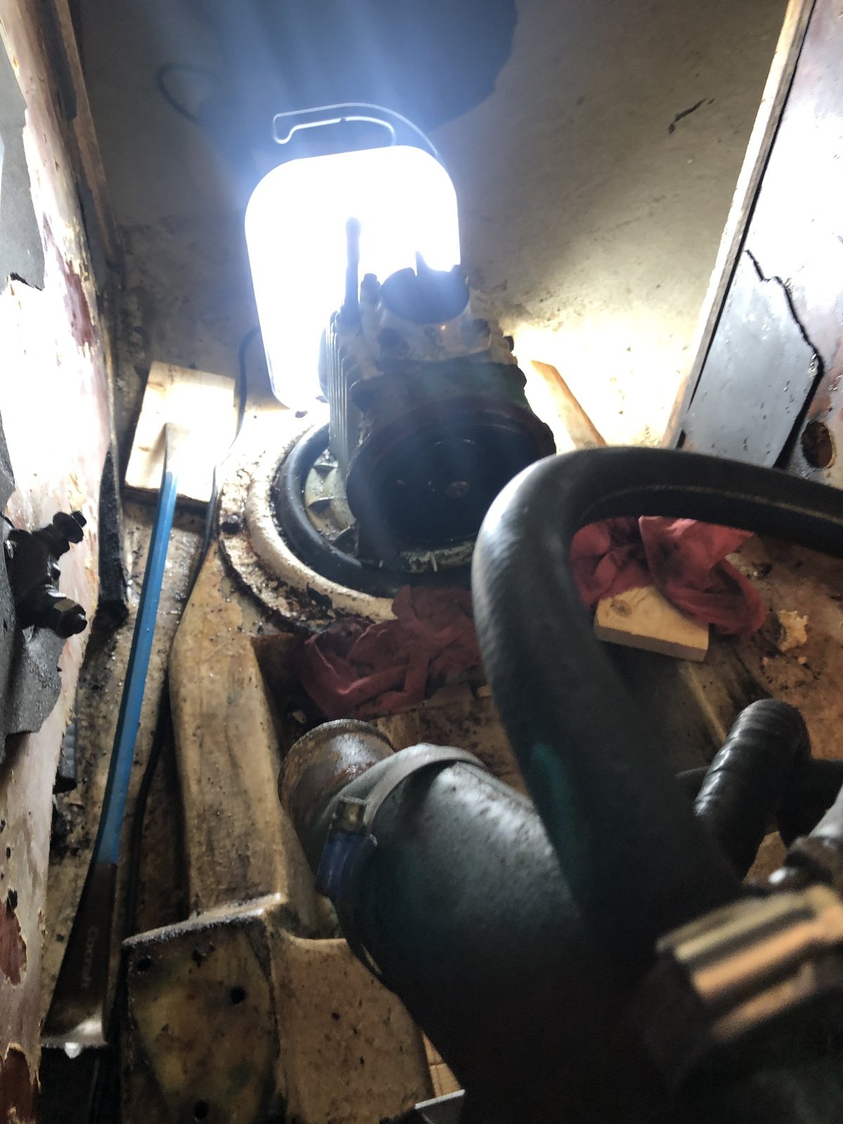 Sedan var det dags att demontera S-drevet. De flesta skruvarna gick bra att skruva ur men den som varit under den läckande sjövattenpumpen var såpass rostig att skallen snabbt intog en rund form. Men med rörtång kunde jag till slut få upp även den skruven. Sedan var det bara att lyfta upp och in drevet i båten.