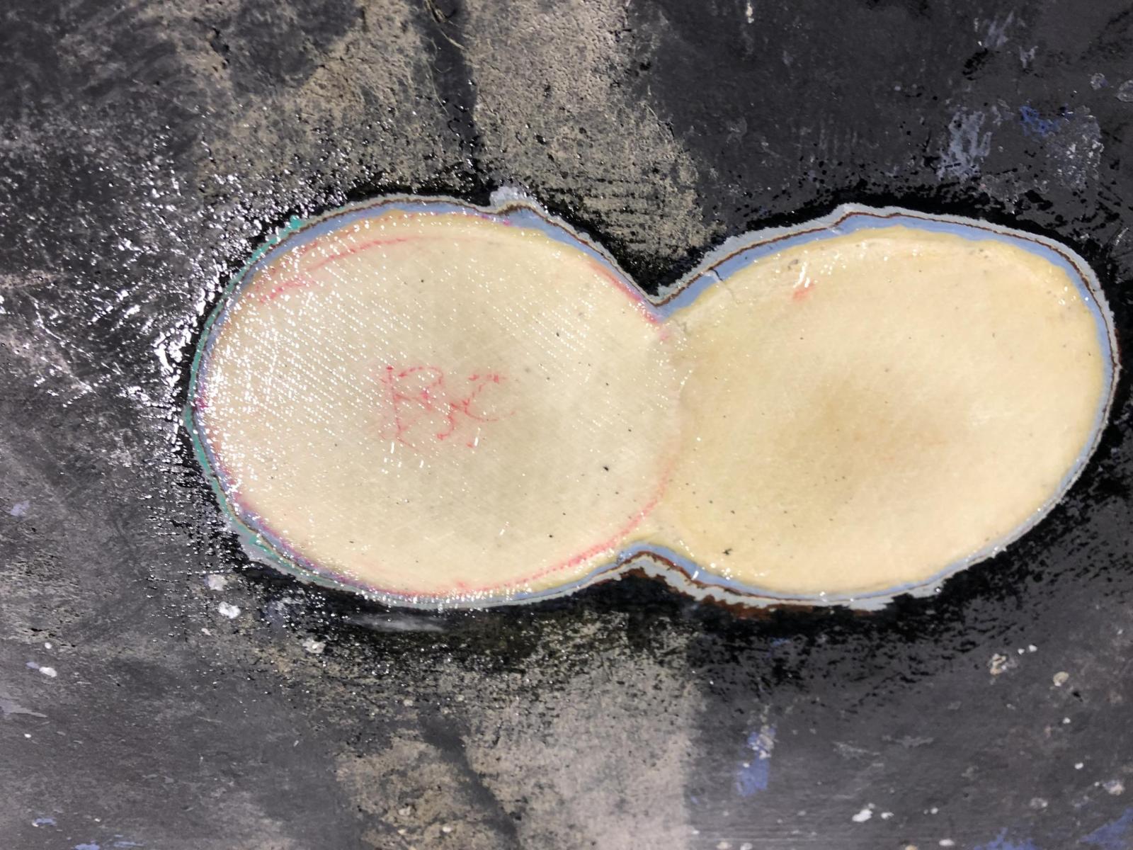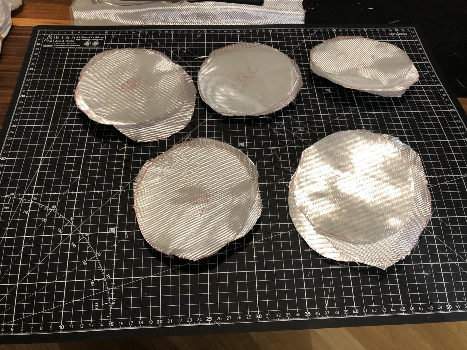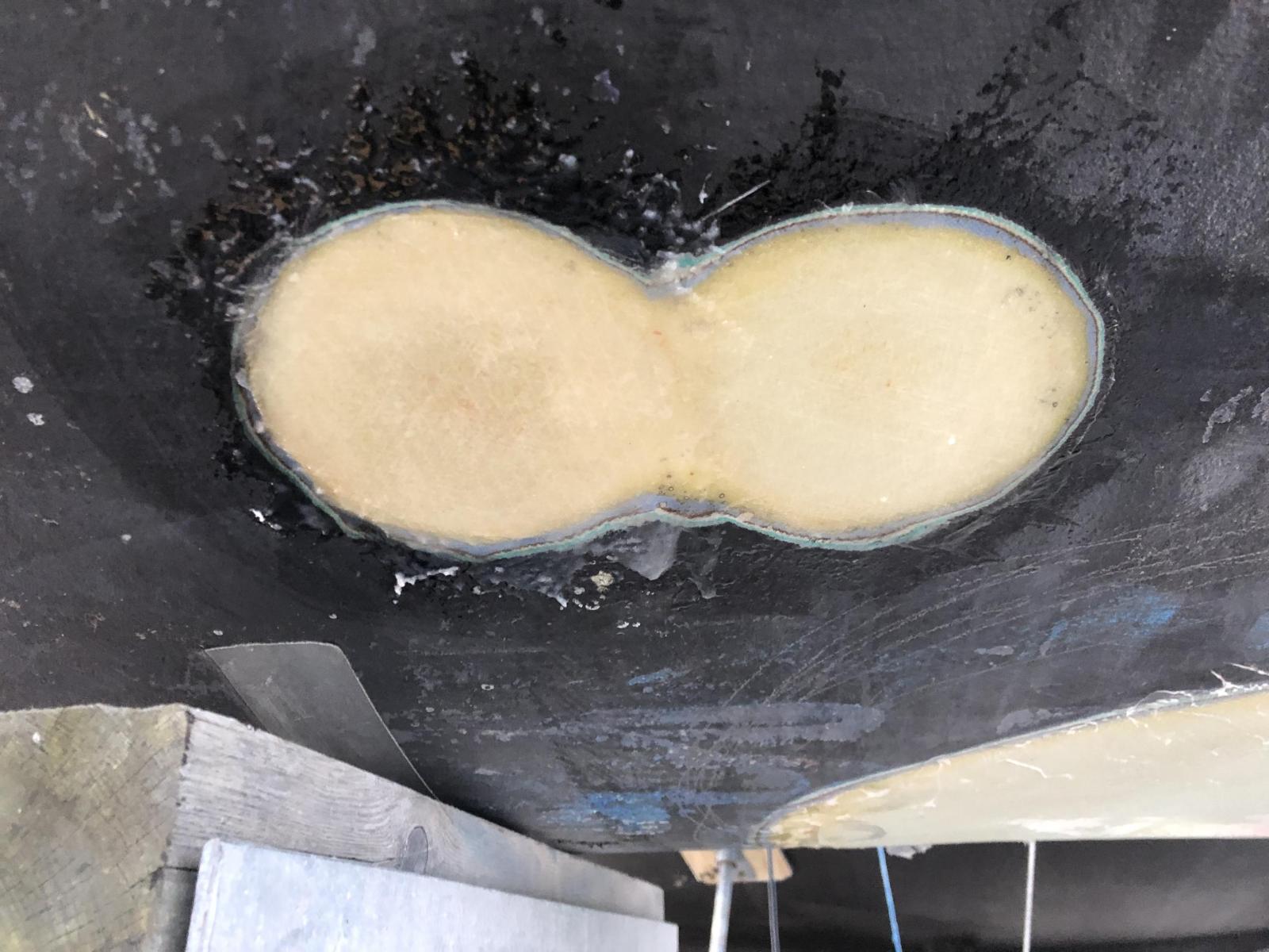 Det visade sig att fasningen var en aning kurvig istället för helt linjär. Detta gjorde att det bildades en liten svacka mellan skrovet och kanten av lapparna när jag kommit ungefär 2/3. Det löstes med förtjockad epoxi i kanten varvat med några färre lager tyg. Totalt hade jag klippt till 20 lager 600 g/m¨2 och två lager 290 g/¨2 twill, vilket ger ett laminat på dryga 16 mm. God marginal för ett skrov som är 12 mm med andra ord.