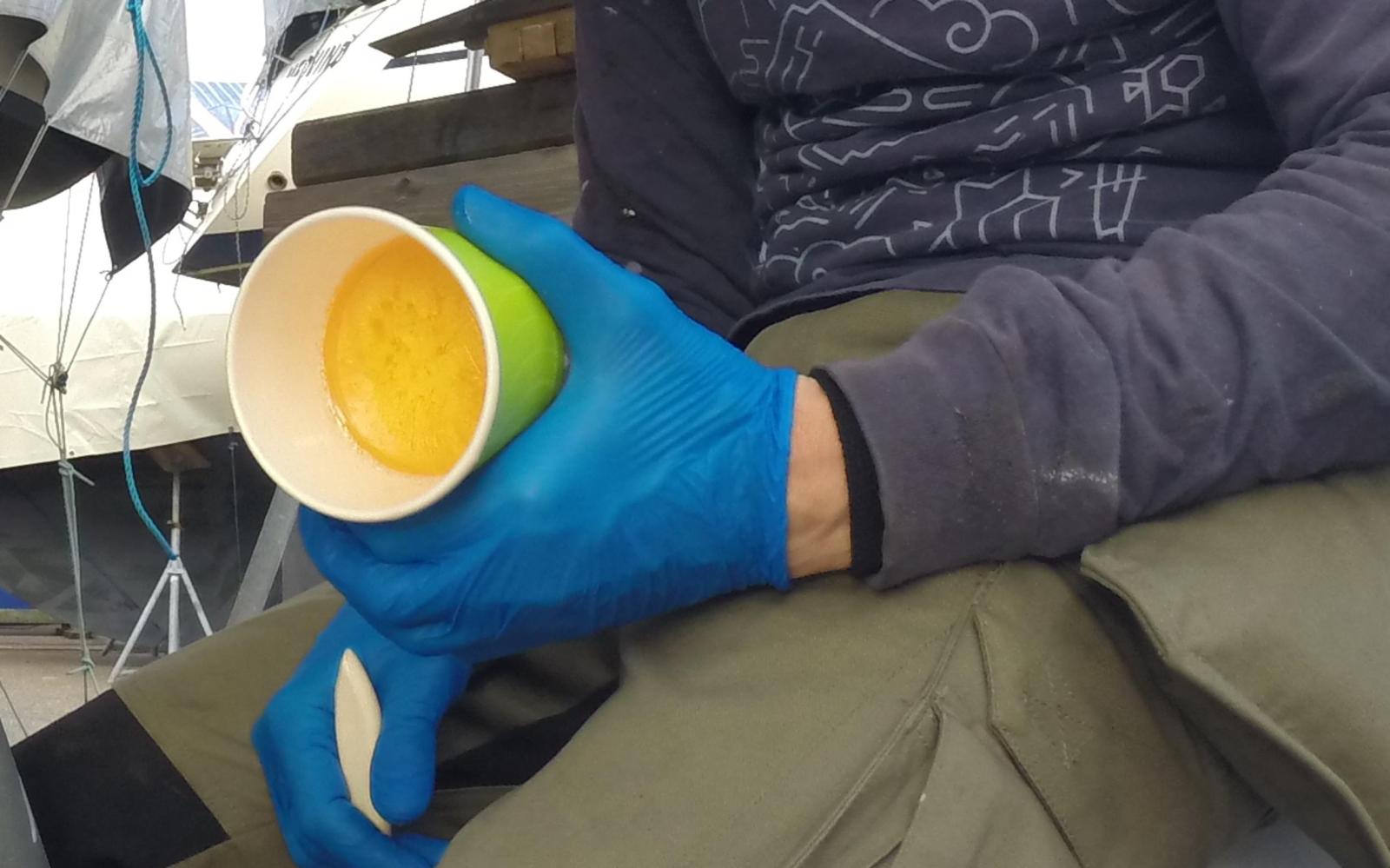 Tyget var färdigklippt och lagt högar – en för varje hål + en extra. Så var det bara till att kila fast värmaren på insidan skrovet och blanda plast. Med en utetemperatur på strax under 10 grader körde jag med snabb härdare till epoxin. örsta blandningen var på 66 gram. Jag han lägga ett par lager tyg innan blandbyttan innehöll en het och helt stelnad klump med plast. Fastän det bara var ca 10 grader ute kunde jag bara blanda 33 gram i taget. Fördelen med att kunna plasta i så låg temperatur har sina nackdelar, inte bara den korta geltiden, epoxin har mycket högre viskositet d.v.s. den är mer trögflytande och väter därför inte väven lika enkelt. Med bara 33 gram åt gången blev det ett väldigt klättrande upp i båten för att bland och ner på backen för att plasta.