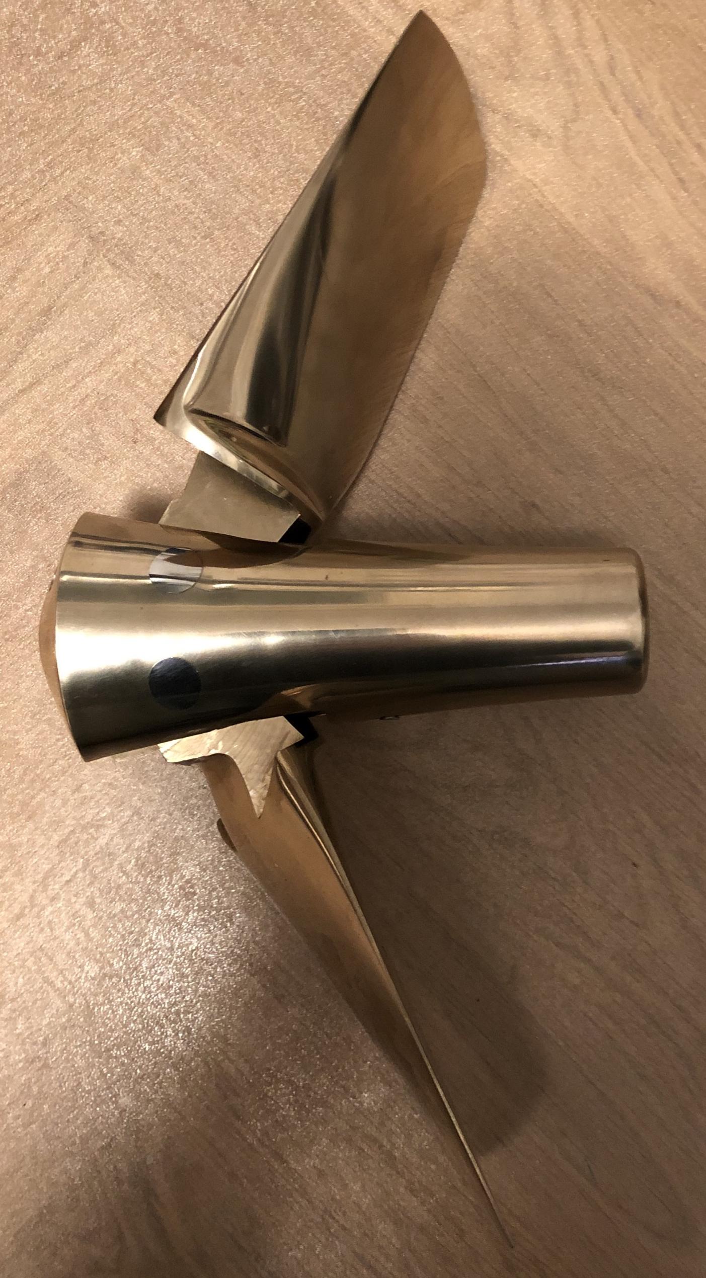 Varför är det så viktigt med rätt propeller då? Jo det avgör var vi kommer att borra hålet för axeln. Tänk om vi behöver gå upp i storlek på propeller, då kommer den kanske inte att få plats. Nu är nog det inte så troligt och om, det skulle behövs "mer" propeller så får vi i så fall byta till en 3-blad.