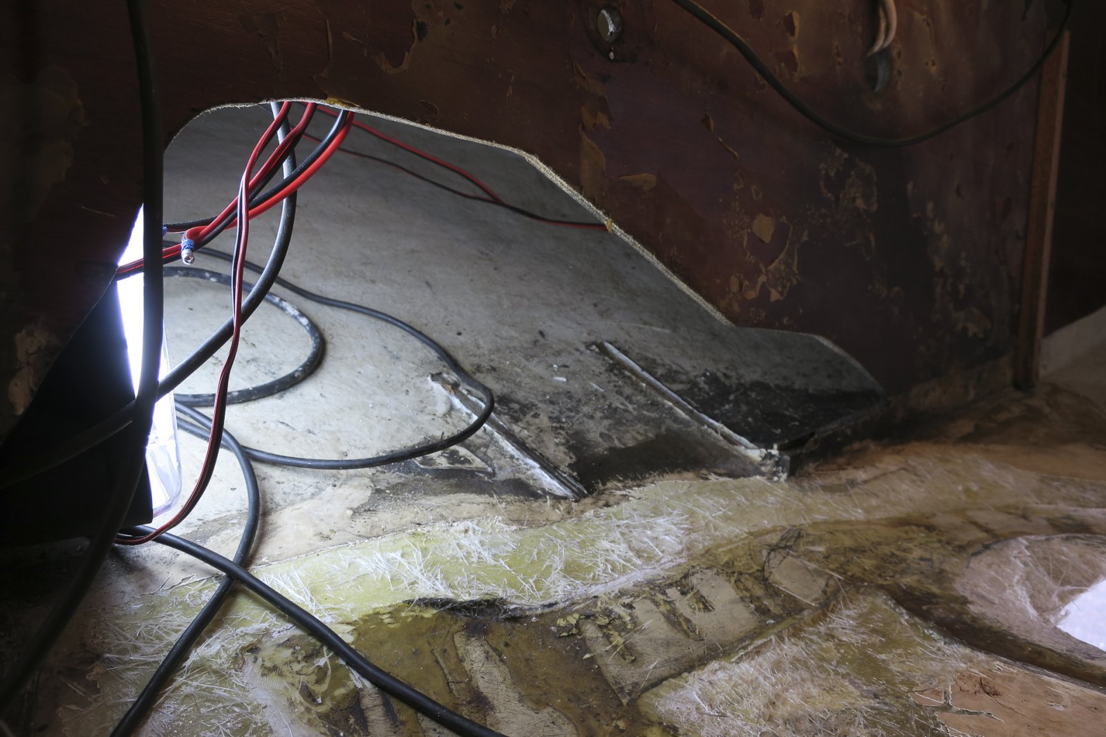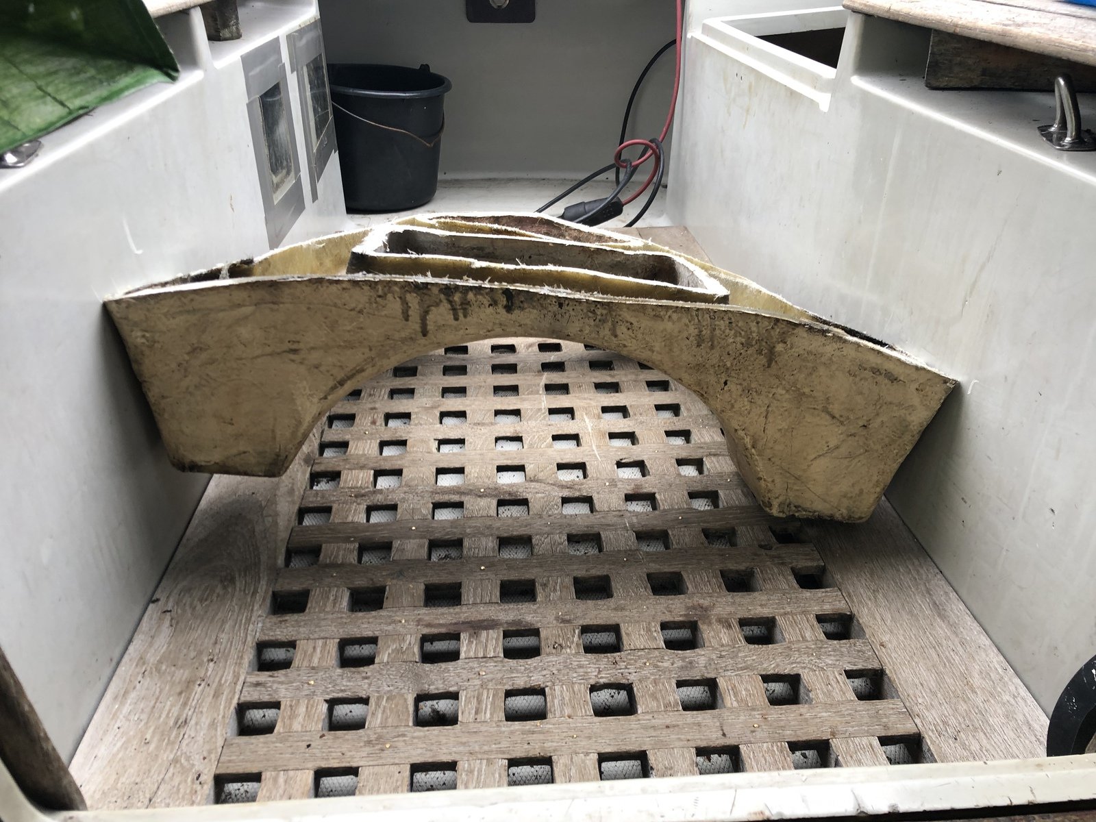 Med en Fein multimaster var det bara sedan att såga upp ett snitt hela vägen runt motorbäddens in och utsida. I framkant låg en del olja som rann ut men annars var det ett ganska enkelt jobb. När hela motorbädden väl var loss var det bara att lyfta ur den. Eftersom plastningen av bädden verkade var gjord ovanpå den gamla gelcoaten var inte vidhäftningen helt hundra, så jag passade på att såga bort de lager med matta som plastats på insidan bädden. Med ett par snitt med multimastern gick det bra att bräcka loss det med kofot, kniv och hammare. Sedan återstod det roligaste – slipning och efter ett par timmar var spåret av motorbädden helt borta.
