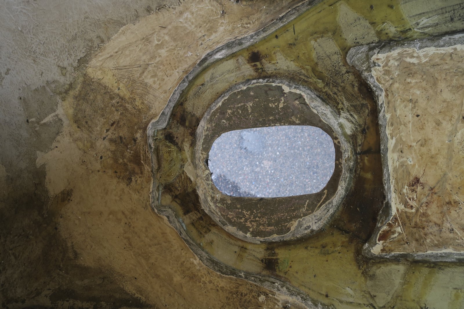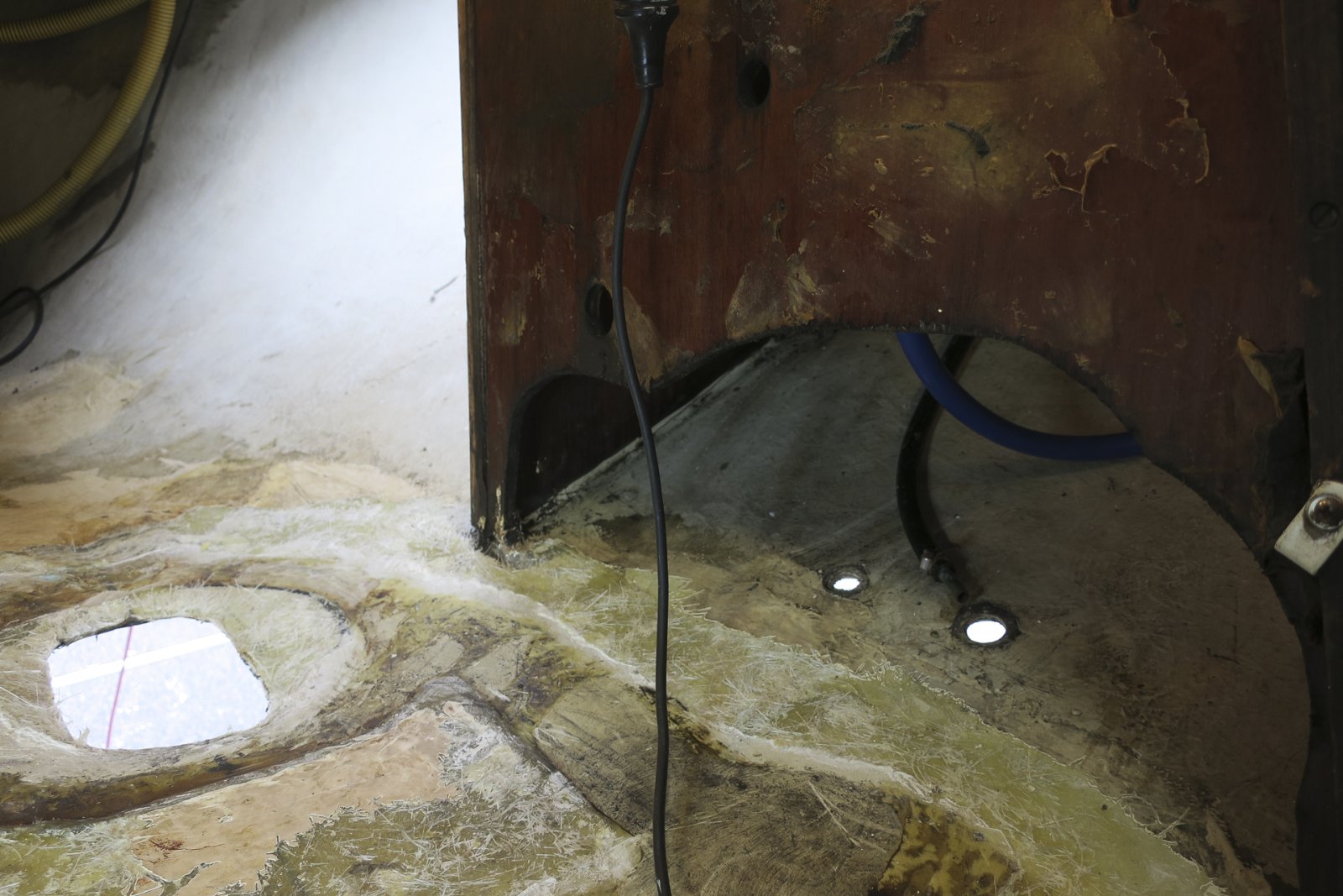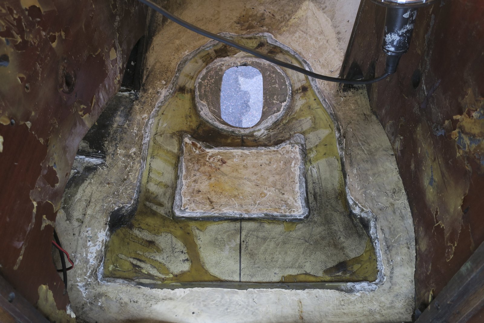 Det som nu återstår är att fasa av kanten på det gamla drevhålet, både från in och utsida innan det kan plastas igen.