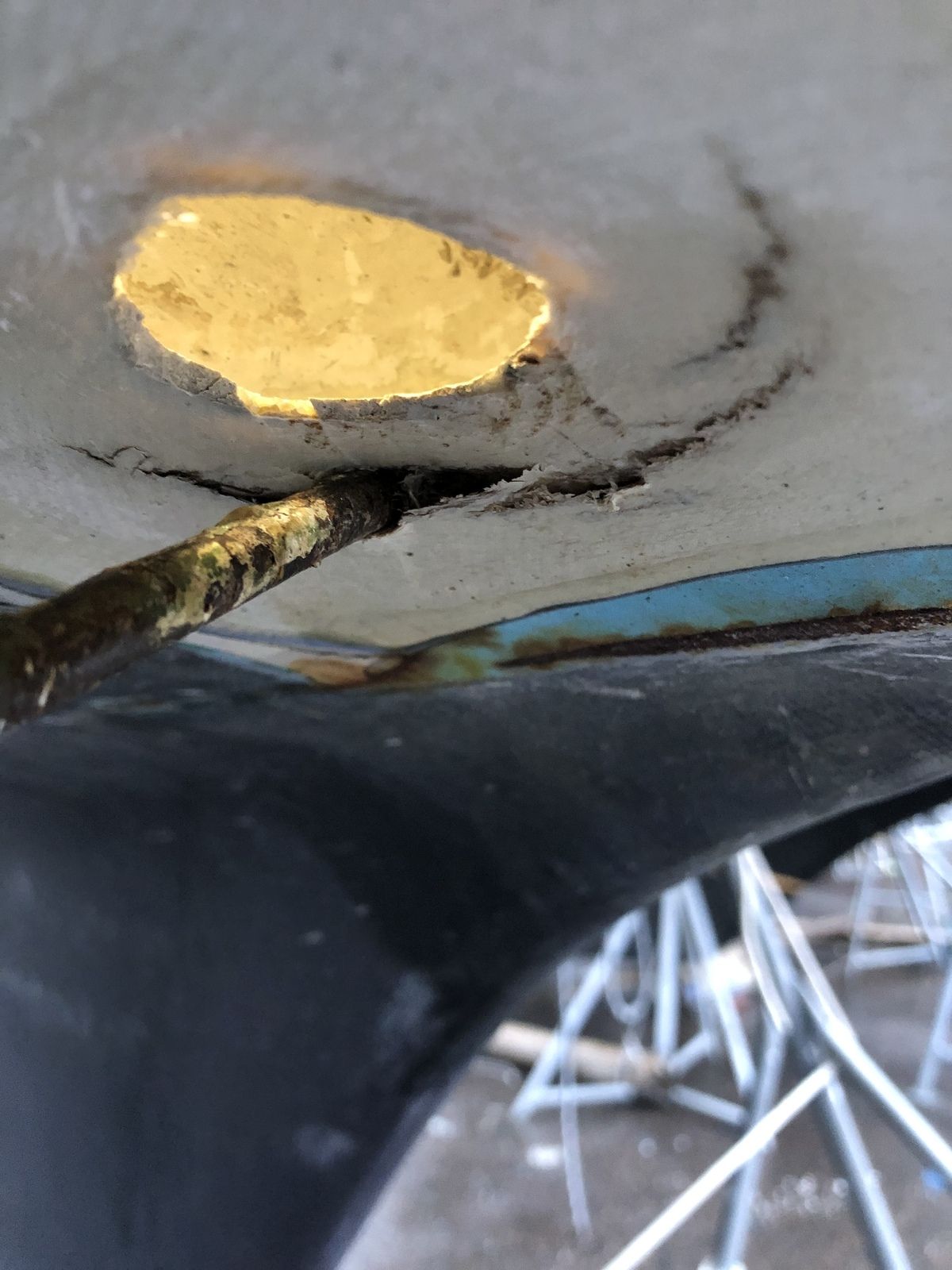 Har du ett runt hål är det hela enkelt och du kan gå vidare till nästa steg, eller läsa precis hur vi pluggade igen ett par bordgenomföringar. Är det fråga om en slagskada är det hela mer komplicerat. Vid en kollision uppstår spänningssprickor, ibland en bit bort från själva hålet. Spänningssprickor är ett tecken på att laminatet är försvagat och har försämrad hållfasthet. För att få en lagning lika stark som originalet behöver ofta hela området med dessa sprickor åtgärdas.