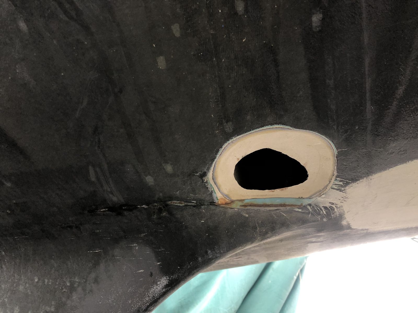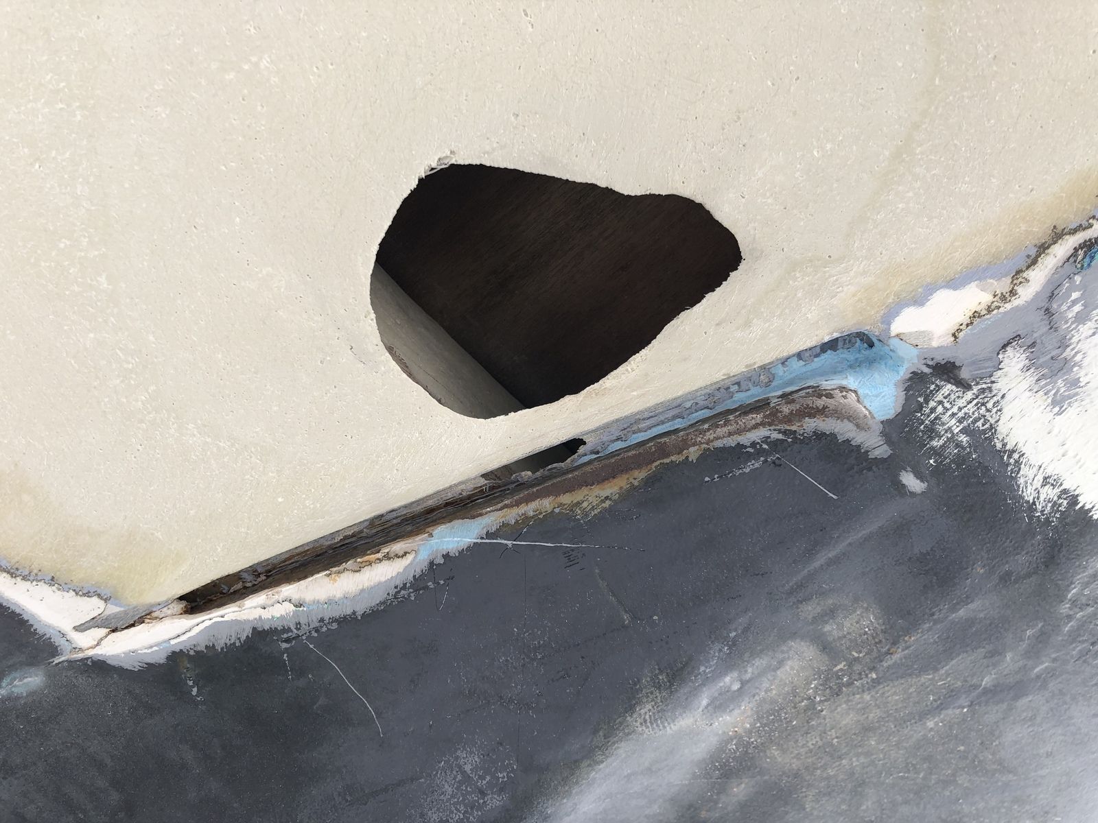 Bilderna nedan visar vad som vi först trodde var ett mindre plast jobb för att slå igen hålet efter en gammal logg men som sedan visade vara ordentligt mycket större. Det hela handlar om att vara säker på att inte plasta in dåligt / sprucket laminat, utan hellre, som bilderna visar, öppna upp mer och slipa vidare,