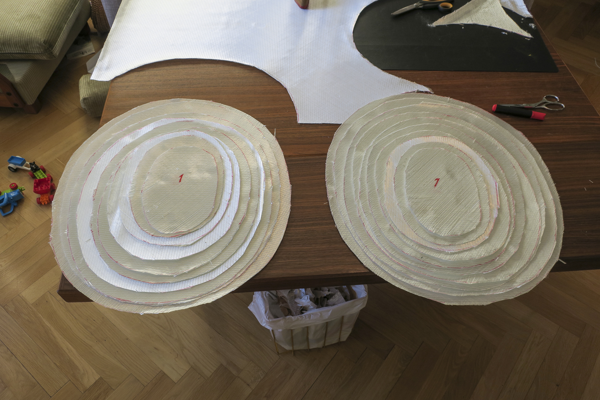Klipp till bitar av glasfiber i successivt större och större bitar, där den minsta biten motsvar storleken för det ursprungliga hålet och den största är så stor som den uppritade linjen visar. Antalet laglappar beror på vilken tjocklek av glasfiber du använder men tanken är att den gradvis ökande storleken skall matcha fasningen du slipat runt hålet.Som tumregel kan man säga att ett lager med väv som väger 500 g/mm2 ger ett laminat som är 0,5 mm tjockt om man är van att arbete med plast. Om man t.ex vill nå en slutgiltig tjocklek av 6 mm behövs 10 lager med glas som väger 600 g/mm2. Man får sedan räkna ut en passande storleksökning för varje laglapp. Ett smart tips är att numrera lapparna, ha dem i storleksordning och lägga dem i ett stort kuvert eller rulla ihop hela bunten.